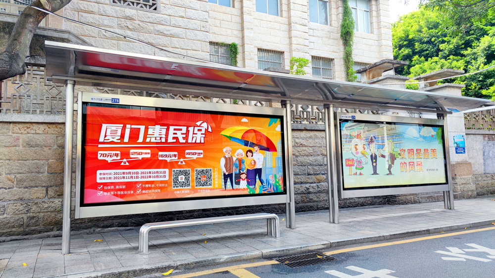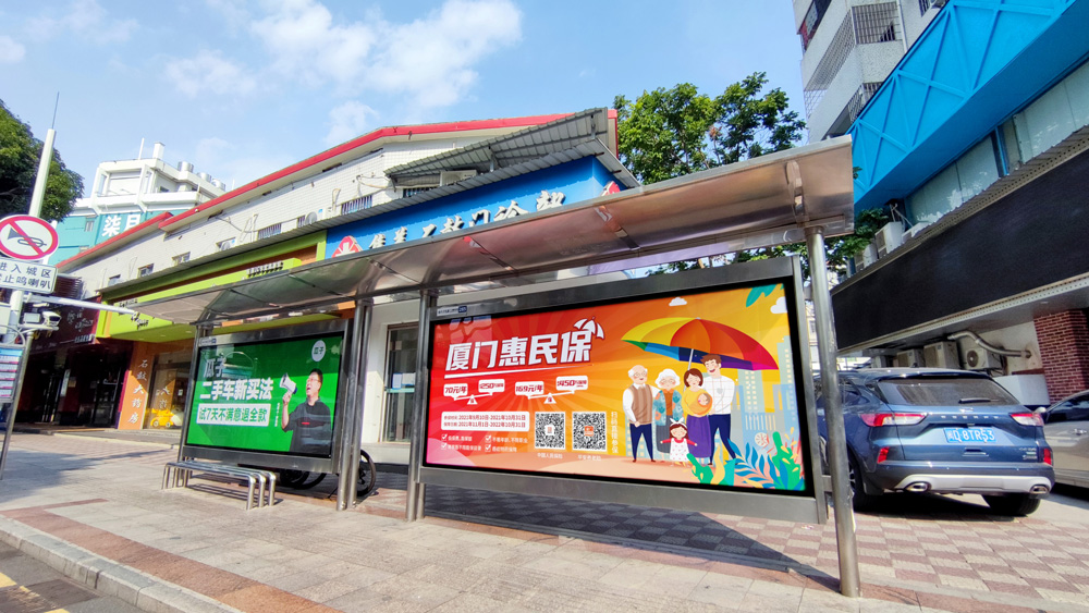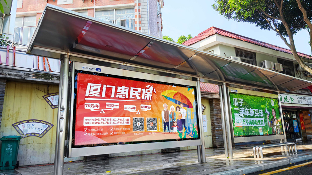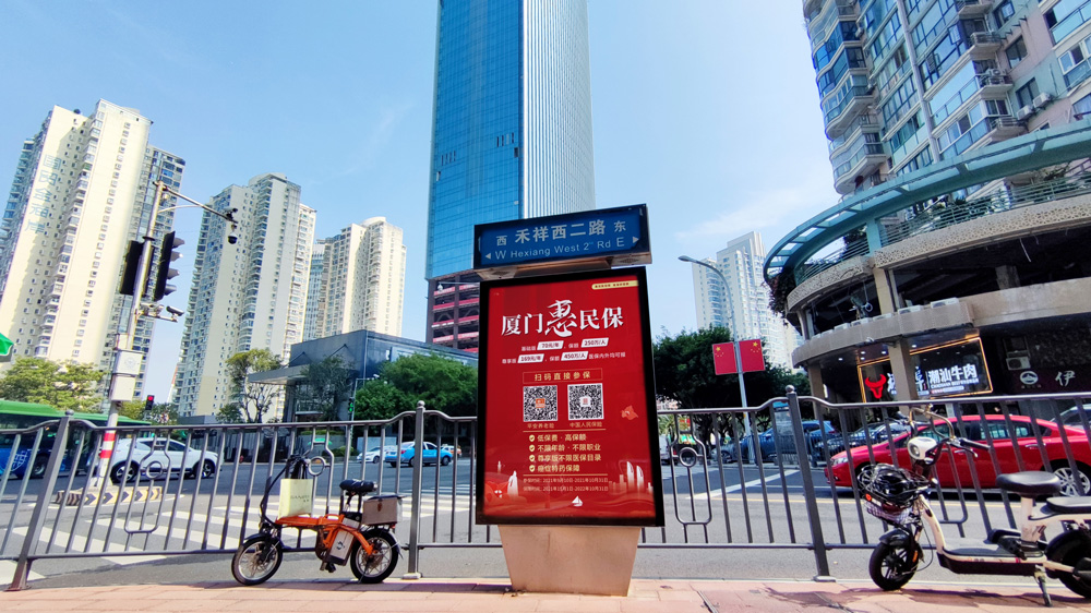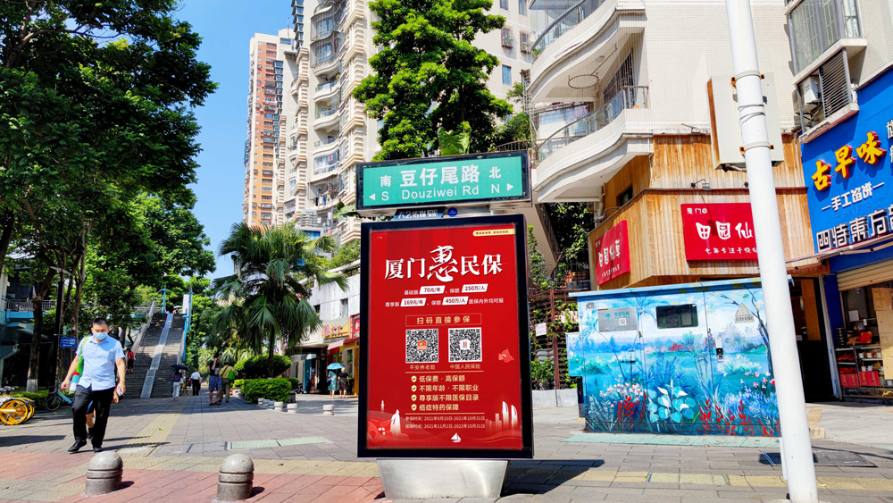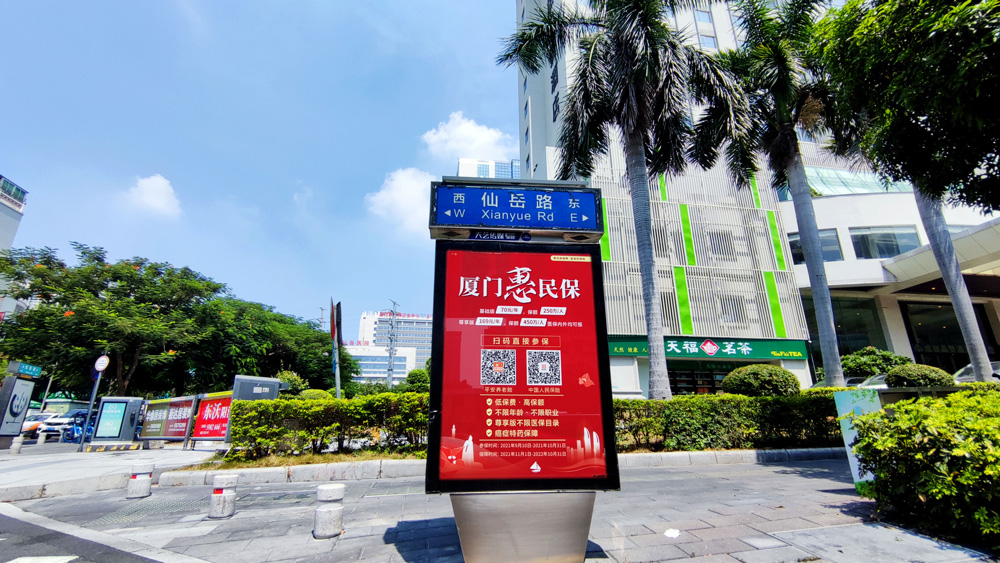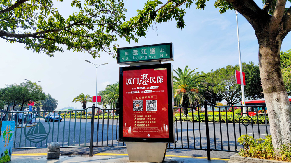 目前“惠民保”在全廈門(mén)市島內(nèi)外各個(gè)主干道及主干道交叉口、黃金的人流車流途徑處、居民生活住宅區(qū)等路段投放多個(gè)城市路名牌、公交車候車亭。